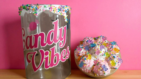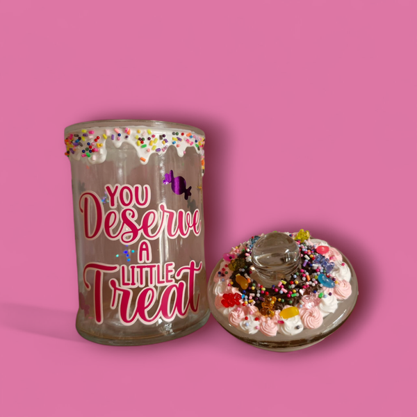 Diverse snoeppotjes in verschillende soorten en maten. De pot is gedecoreerd met hoogwaardig vinyl en de deksel is voorzien van een prachtige toef slagroom en allerlei verschillend snoepgoed!