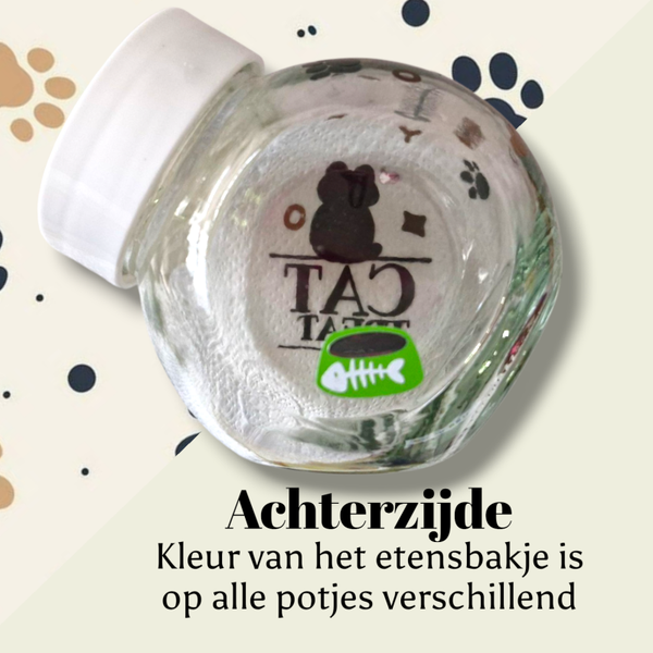 Op de achterzijde van de potjes is een voerbakje in een assortiment verschillende kleuren afgebeeld en daarbij is voldoende ruimte vrijgehoudrn om de naam van jouw huisdier te plaatsen.